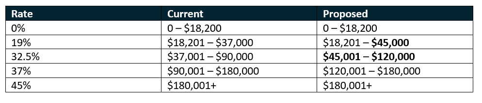 These changes mean that the upper threshold of the 19% personal income tax bracket will be increased from $37,000 to $45,000 and the 32.5% personal income tax bracket from $90,000 to $120,000.